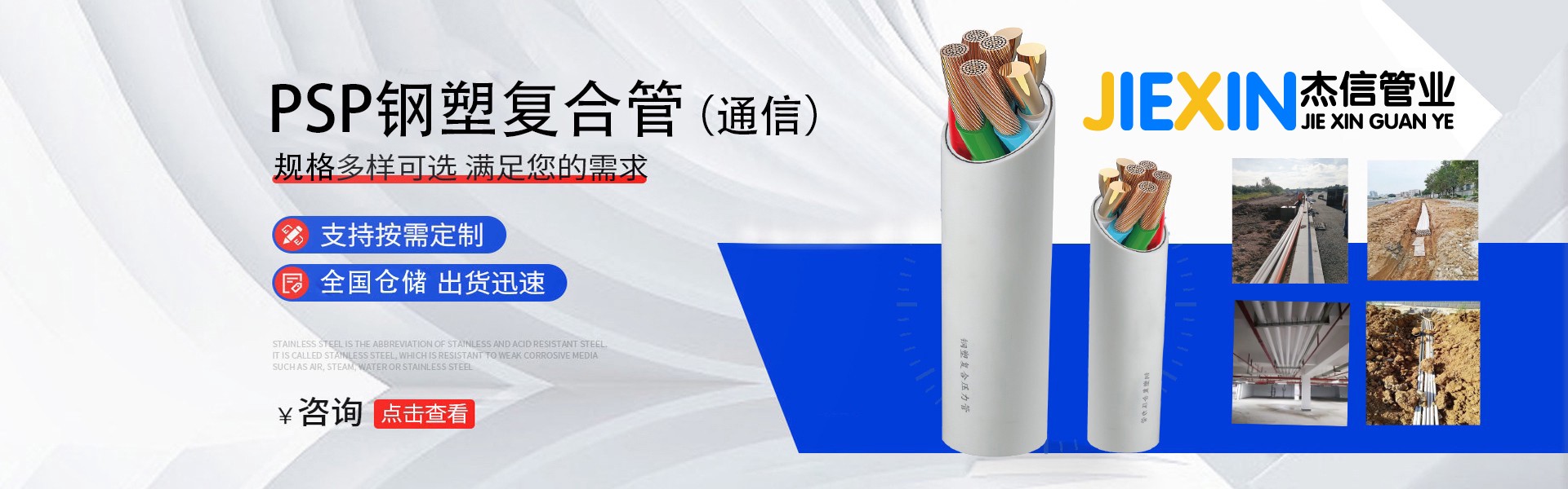 杰信管業銷售PSP鋼塑復合壓力管及配套管件,孔網鋼帶塑料復合管,鋼絲網骨架塑料復合管,鋁合金襯塑復合管等管道產品。
